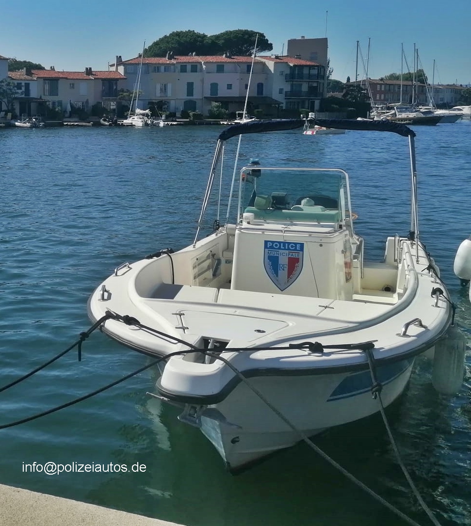 Boot der französischen Polizei im Hafen vom Grimaud, gelegen an der Mittelmeerküste (Côte d’Azur).