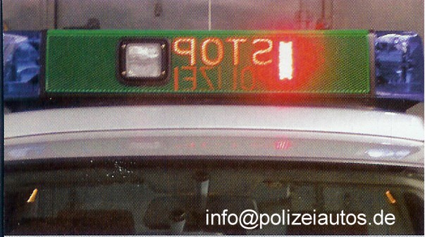 Beschreibung: Bayernweit wurden seit Juli 2003 vier Streifenwagen des Typs BMW 530d Touring eingesetzt. Diese wurden probehalber in Betrieb genommen, damit zum einen die damals neue Bauchbinde (reflektierende Rundumbeklebung) getestet werden konnte und zum anderen kam erstmals eine neue Sondersignalanlage vom Typ Hella RTK 6 SL zum Einsatz (siehe Bild 2). Diese hat neben den bisherigen Halogenblitzleuchten, dem blauen, nach vorne gerichteten LED-Blitz und der Anhaltevorrichtung STOP POLIZEI in Spiegelschrift einen starken Arbeitsscheinwerfer, einen roten LED-Blitz, der zusammen mit der Anhaltevorrichtung angeschaltet wird, sowie ein sog. YELP-Signal (Heulton, zwei Sekunden lang und 110 Dezibel laut). Dieses Signal ist zusätzlich zur Anhalteeinrichtung einschaltbar und soll das Anhalten eines vorausfahrenden Fahrzeugs erleichtern. Fotos und Infos: APS Bad Kissingen/Oberthulba.