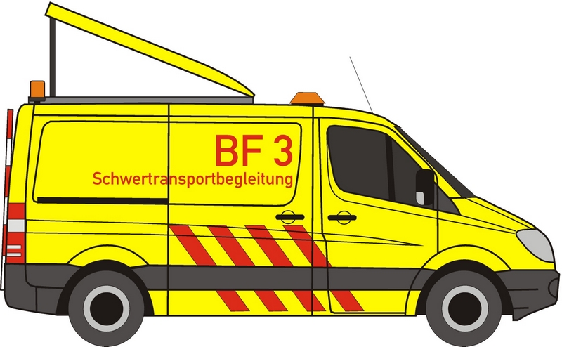 Fahrzeug für die Absicherung von Schwertransporten. Bitte beachten Sie die Hinweise in der