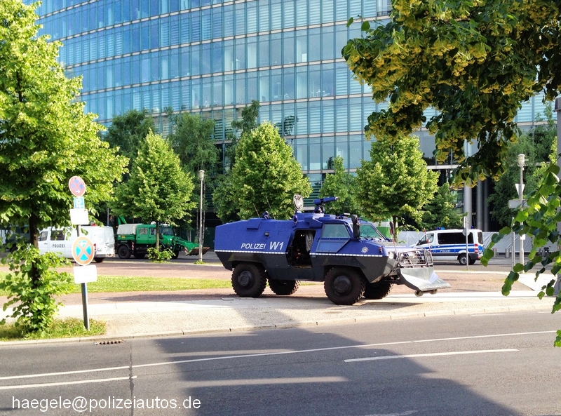 Das Hotel des Staatsgastes am Potsdamer Platz wurde umfangreich abgesperrt. Dabei im Einsatz sind auch zwei Sonderwagen 4 der Polizei NRW.
