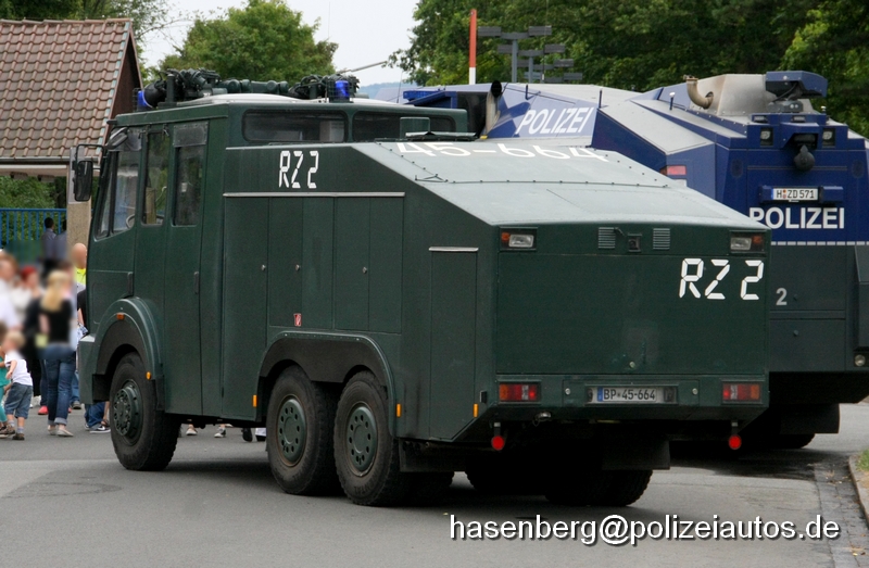 | Beschreibung: | Wasserwerfer 9000 (Wawe 9, Kfz 56/3 gl) Auf dem 2. Bild kann man die Dachkennung des Fahrzeuges erkennen, diese ist nicht wie die taktische Kennung in digitaler Schriftart ausgeführt. Auf diesen Bildern ist an der linken Seite ein Schornstein zum Schutze der Einsatzkräfte montiert. |