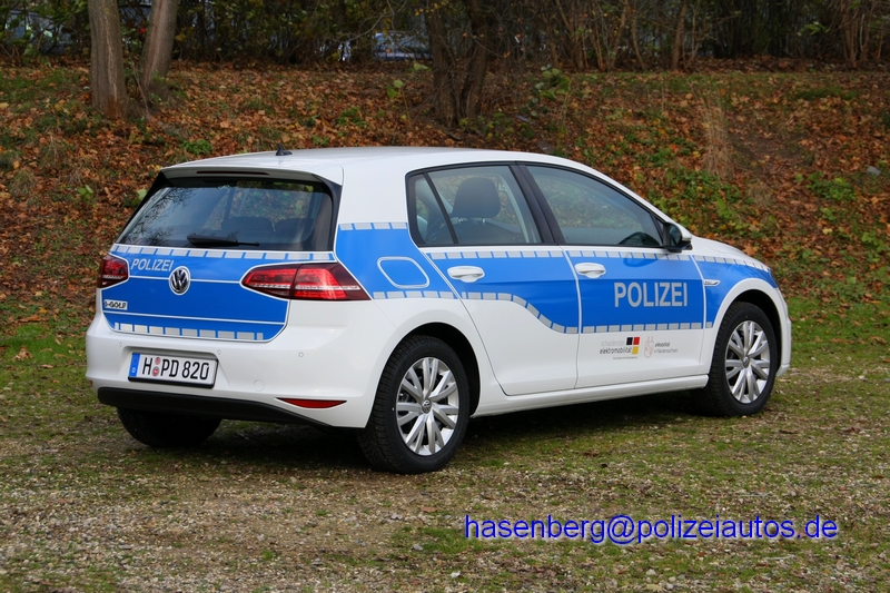 Im Rahmen des Elektromobilitätsfuhrpark wurden Ende 2014 mehrere VW eGolf an die Landespolizei Niedersachsen übergeben. Die Fahrzeuge werden im Ermittlungs- und Botendienst eingesetzt. Eine Verwendung im Streifendienst ist nicht vorgesehen. Der mit Elektroantrieb versehene Golf hat mit einer Akkuladung eine Reichweite bis zu 190km. |