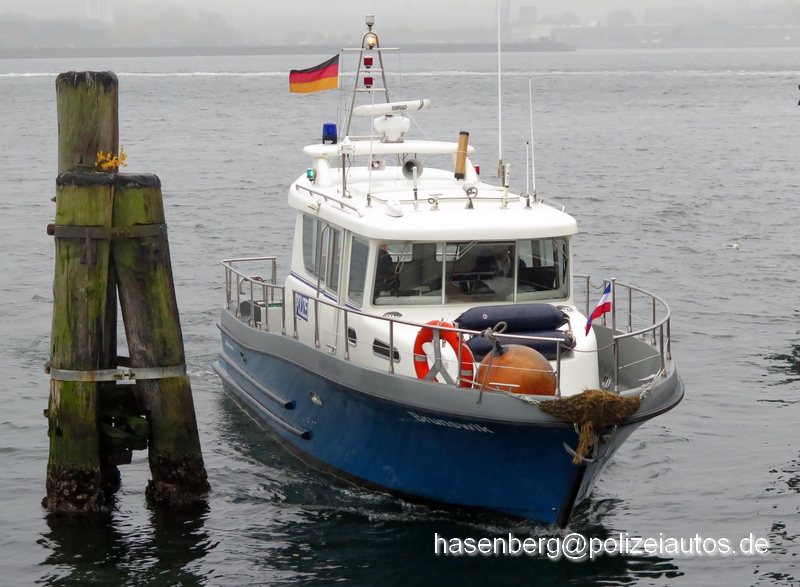 Bootstyp MINOR 34, Bauwerft Sarins Batar, Kokkola, Finnland. Deutscher Importeur Harle Yachtbau aus Esens, Niedersachsen. Technische Daten: Länge: 10,40m, Breite: 3,40m, Tiefgang: 1,10m, Geschwindigkeit: 30 kn Antrieb: Doppelmotorenanlage 2x 6 Zylinder Reihenmotoren mit je 272 kW und abgewinkelten ZF Getrieben und vierflügligen Bronzepropellern. Bau unter Aufsicht der Finnish Maritime Administration, Standard „work boat“. Rumpfzertifizierung durch den Germanischen Lloyd Bau- und Ausrüstungs- Sicherheitszeugnis durch die Seeberufsgenossenschaft Rumpfform mit gekimmten Steven und scharfen 1. V-Spant für gute Rauwassereigenschaften und schnelle Gleitfahrt. Sicheres umlaufendes Arbeitsdeck mit Schanzkleid. Gute Manövereigenschaften durch hydraulische Doppelruderanlage und automatische Trimmklappensteuerung. Moderne Navigations- und Funksicherheitseinrichtung mit: SIMRAD Blackboxradaranlage mit 17 Zoll TFT Monitor und Antikollisionsmodul SIMRAD Differential GPS Navigator mit C-Map Seekartensystem, Wegpunkten- und Routenprogrammierung. Automatic Information System (AIS), Navtexreceiver für nautische Warnmeldungen, Navigationsecholotanlage und Dopplerlog SAILOR UKW- Seefunkanlage, Satellitennotfunkbarke, Radartransponder, Handsprechfunkgeräte sowie Polizeifunkanlage Heimathafen: WSPR Kiel Info: Homepage der Polizei SH |