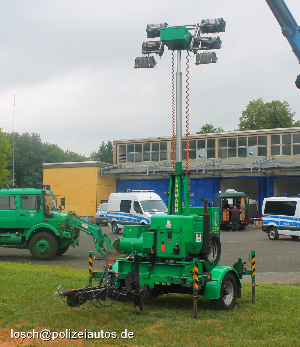 | Beschreibung: | 1-achs. Lichtmastanhänger zur Ausleuchtung von Einsatzräumen. Technische Daten: 6 Strahler a 1500 Watt, auf 9,5m ausfahrbar. Der Anhänger wurde aus dem Bestand der Bereitschaftspolizei Baden- Württemberg übernommen, die weiße Kennung "21" links unterhalb der Verglasung des Bedienfeldes (Bild 3) deutet noch auf seine Ursprüngliche Herkunft hin. |