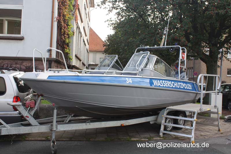 | Beschreibung: | Trailerbares Polizeistreifenboot W34 der WSP Niedersachsen, Heimathafen Nienburg. Technische Daten zum Boot: Bootstyp: Streifenboot (trailerbar) Bauart: Gleiter – Knickspantbauweise Baustoff Bootskörper: Marinealuminium Aufbauten: Cabrio Verdeck Baujahr: 2003 Bauwerft: FISKARS (Finnland) Länge ü.alles (m): 6,70 Länge Wasserlinie (m): 5,65 Breite ü.alles (m): 2,40 Breite Wasserlinie (m): 1,83 Gewicht Kg: 880 (ohne Zuladung und Motor) Tiefgang (m): 0,36 Verdrängung in t.: 0,88 Personen/Tragfähigkeit (Kg): 8/600 Kraftstofftank: 170 l Antrieb: Motortyp: Außenbordmotor Yamaha, F 225 AETX, 6 Zylinder kW/PS: 165 Kw/225 PS bei 5000UpM Antriebsart: Viertakt Einspritzer (Ottokraftstoff) Motorgewicht: 272 kg Höchstgeschwindigkeit: 50kn/ 90km/h. Ausrüstung: Echolot (Lowrance x125), GPS (Furuno GP-32), Polizeifunk (2m u. 4m), Schiffsfunk (UKW und Seefunkdienst) elektrische- u. Handlenzpumpe, Eberspächer Standheizung, Feuerlöscher, Digitaler Drehzahlmesser (u. a. mit Trimmanzeige, Betriebsstundenzähler), digitaler Geschwindigkeitsmesser (u.a. mit Kraftstoffanzeiger), Landanschluß, Kommandoanlage, Geräteträger (Scheinwerfer, Blaulicht, Lautsprecher, Funkantennen u.a.) Einsatzgebiet: Mittelweser, Aller, Hamme, Dümmer See. Sondereinsätze erfolgten bereits auf der Nord- und Ostsee. |