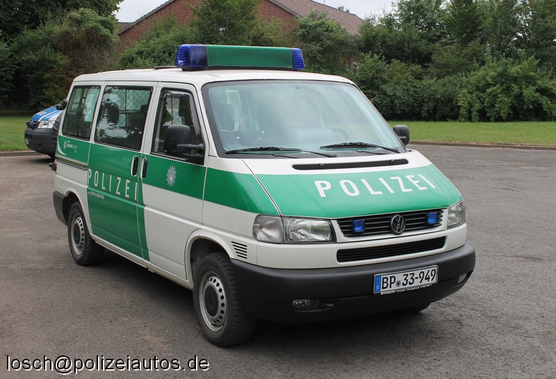 | Beschreibung: | Halbgruppenkraftwagen mit Allradantrieb, hier in der bei der Bundespolizei selten anzutreffenden Ausführung mit 2. Schiebetür bei einem grün/weißen VW T4. |