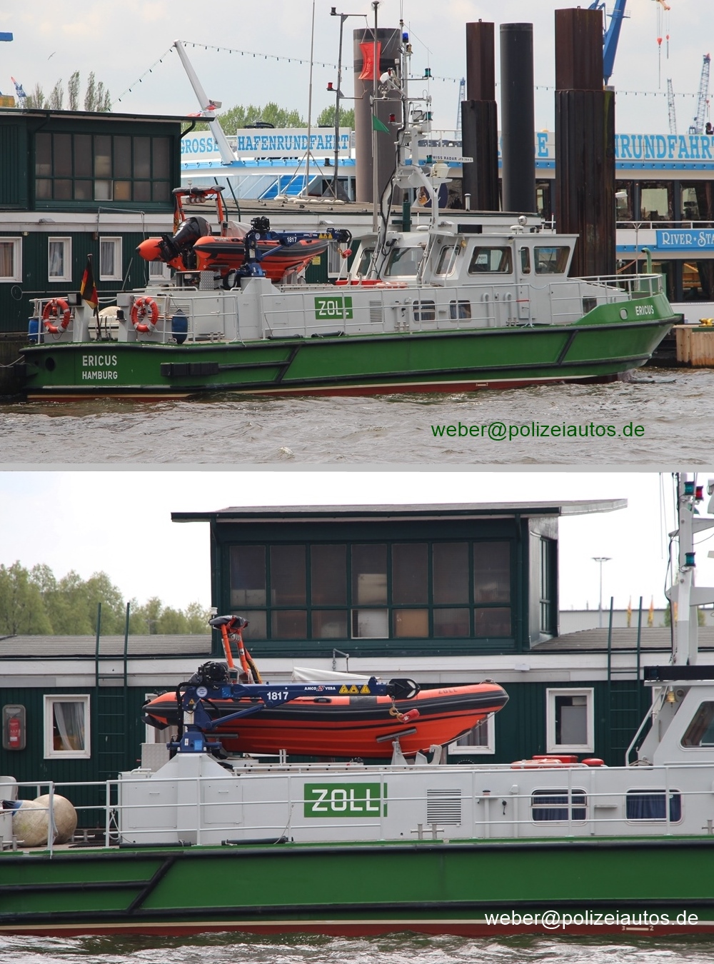 | Beschreibung: | Zollboot Ericus im Hamburger Hafen, nahe den Landungsbrücken. Zwischenzeitlich wurde es mit einem Tochterboot (einschl. Bootsdavid -Kran-, Hersteller: Amco Veba) nachgerüstet. In 2019 erhielt der Rumpf einen kobaltblauen Anstrich. |