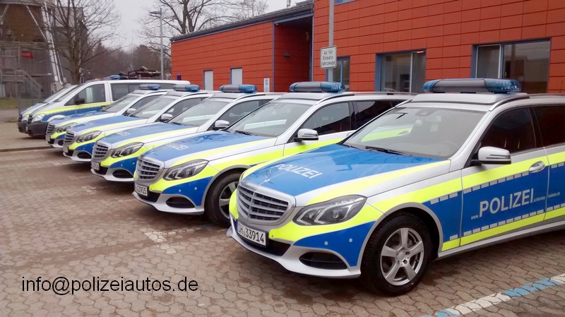 An einem ruhigen Tag konnte der gesamte uniformierte Fuhrpark einer Autobahnwache auf einem Bild vereint werden. Als Streifenwagen sind zur Zeit in Schleswig -Holstein Mercedes-Benz E-Klassen im Einsatz. Als Sicherungs- und Kontrollfahrzeuge werden Mercedes-Benz Vito verwendet. |