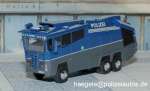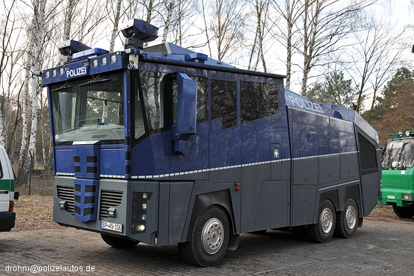 Beschreibung: Wasserwerfer 10 (KFZ 56-3) zur Erprpobung bei der Bundespolizei. Der WAWE ist ingesamt 9,9 Meter lang, 2,55 Meter breit und 3,7 Meter hoch. Rosenbauer gibt ein zulässiges Gesamtgewicht von 31.000 kg an. Im beheizbaren Wassertank werden 10.000 Liter Wasser mitgeführt. Die Pumpenanlage ist im Heck des Fahrzeuges eingebaut und wird mit einem eigenen Pumpenmotor von Deutz angetrieben. Auf dem Dach sind drei Werfer montiert. Nach der Erprobung wurde das Fahrzeug an die Hamburger Polizei übergeben und läuft dort nun mit der Kennung HH3