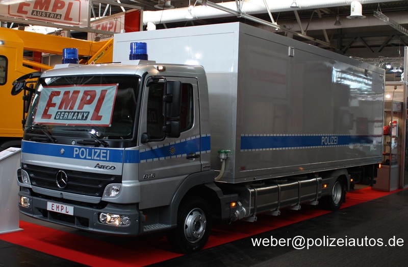 | Beschreibung: | Auf der IAA-Nutzfahrzeuge 2010 war auf dem Stand der Fa. EMPL ein Toilettenkraftwagen auf Basis eines MB Atego 816 L ausgestellt. Der Flyer am Fahrzeug weist es als Fahrzeug der Landespolizeidirektion Sachsen aus. Für optimale Fotos hatte das Fahrzeug einen zu schlechten Standort, hier ist trotzdem ein Datensatz. Fahrzeugdaten: Motorleistung: 115 KW (165 PS) Radstand: 4.820 mm Auf- und Anbauteile: -Leiter zur Nutzung des Heckstauraumes -1 Fahrzeugfeuerlöscher -Nothammer mit Gurtschneider -Rückfahrkamera mit Bildschirm im Führerhaus -1 Stromaggregat Panda 40001, GFK-Schalldämmkapsel, 230 V, 4 KW mit E-Startfunktion und graphischem Bedienpanel, inkl. 12 V Batterie, Dieselfilter, seperater Dieselpumpe, Abgasführung unterhalb des Fahrzeugbodens -1 BEOS-Ladomat 24 V auf 12 V (zum Batterie Stromaggregat) -Navigatiossystem mit Radio -Fahrzeugfunkanlage (analog und digital) -1 Kfz-Antennenanlage für Digitalfunk Tera 25 und GPS, sowie 4m-BOS, UKW Innenausstattung: -für Frauen: 3 Toiletten m. Hygienezubehör -für Männer: 1 Toilette m. Hygienezubehör -Entlüftung der Abwasserleitung -alle Sanitärelemente in Edelstahl -rutschfester, gummierter Fußbodenbelag -zentraler Abwasser-/Fäkalienbehälter (ca. 800l beheizt) mit entsorgertypischen Anschlüssen und Frostsicherung (Aluminium) -Füllstandsanzeiger bzw. Restsignalisation im Führerhaus -Wasserversorgung der Toiletten und Waschbecken über Hauswasseranlage 230 V -Tageslichtausleuchtung durch lichtdurchlässige Dachluken -Deckenleuchten über den Boxen und dem Handwaschbecken -Eingangs- /Außenbeleuchtung der Zugänge -Licht-Notversorgung der Beleuchtung über Batterie -Stand- /Zusatzheizung für Sanitärbereiche (Diesel aus Fahrzeugtank) -Ent- /Belüftung durch leistungsfähige / geräuscharme Elektrolüfter über jedem Sanitärbereich -Abgesicherte Außenbord-Fremdeinspeisung mit Starterschutz -Isolationsüberwachung -Tiefentladeschutz (Batteriewächter) für die 24 V-Fahrzeugbatterien -2 Umrissleuchten heckseitig oben. |