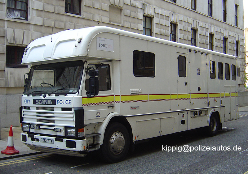 Pferdetransporter der London City Police. Lt. dem Schild über der Fahrertür, wurde das Fahrzeug von der HSBC Bank gesponsert.