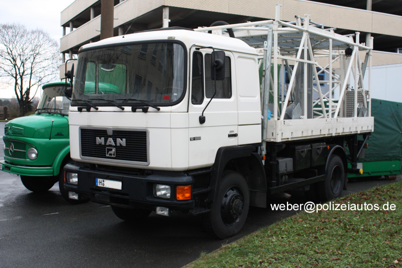 Mastbaukraftwagen der niedersächsischen Bereitschaftspolizei, hier ohne Plane.