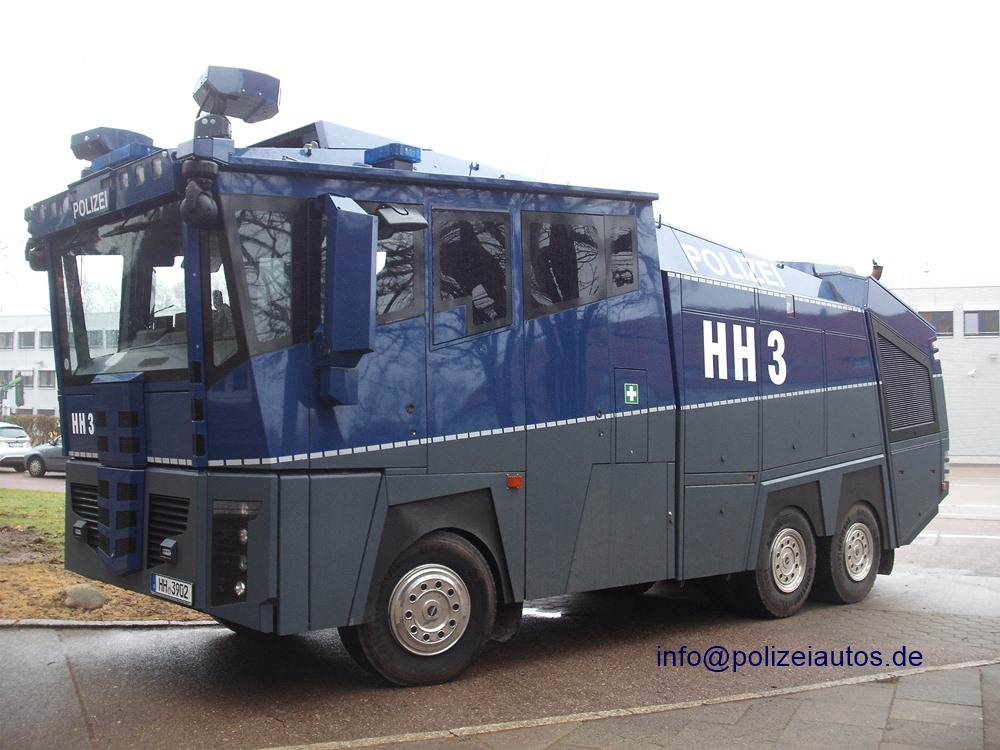 | Beschreibung: | Wasserwerfer 1000. Gegenüber diesem Fahrzeug erhielt dieser WaWe eine zusätzliche, abweichende Beschriftung: HH 3. Hierbei handelt es sich um den damaligen Prototypen des Wawe10. Fotos: Jörns |