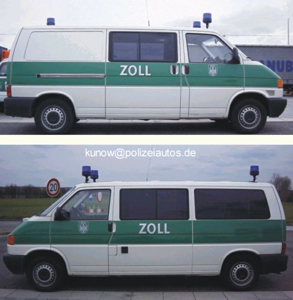 Seit ca. 2001 werden bei den Mobilen Kontrollgruppen (MKG) die bis dato noch im Einsatz befindlichen manilabeige lackierten Sonder-Kfz T4/LR durch farbenfrohe weiß-minzgrüne Versionen ausgetauscht bzw. ergänzt. Die Inneneinrichtung wurde genauso auf die Bedürfnisse abgestimmt, wie die nun deutlichere ZOLL-Kennung im „Polizei-Look“, die auch bereits bei den Pkw Opel Astra Caravan und VW Golf IV Variant verwendet wird. Die drei hellen Stroboskop-Blitzlampen sind besser zu erkennen als die alten "Rundumlichtfunzeln". Die Anhaltesignalgeber sind nun hinten und vorne vorhanden. |