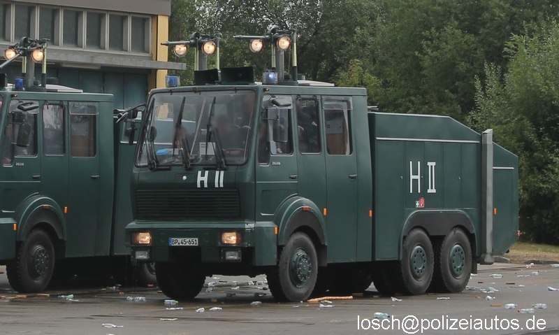 Als Besonderheit verfügt dieser Wasserwerfer an der Vergitterung der Blaulichter über zusätzliche Plexiglasblenden. Weiterhin wurden an diesem Wawe nach Standortwechsel äußerlich einige Veränderungen vorgenommen. So wurden wieder die originalen Typenschilder "2628" montiert, die Stoßstange umgebaut und die Frontblitzer entfernt. Ebenfalls entfernt wurden die auf den Vordertüren aufgeklebten Elefanten, dem Wappentier der vorherigen Wasserwerferstaffel. |