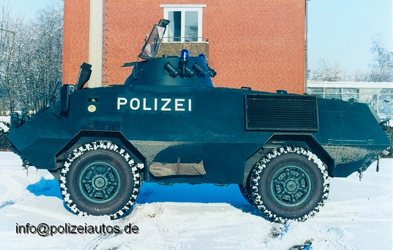 Dieser Fahrzeugtyp wurde als Lizenzbau der Schweizer Fa. MOWAG bei Büssing gefertigt. Im Dienst stand dieser Fahrzeugtyp bei den BePo der Länder und dem damaligen BGS. Bewaffnet war das Fahrzeug der BePo mit einem MG. Nachträglich wurden POLIZEI Schriftzüge zur besseren Kenntlichmachung auf drei Seiten aufgebracht. Bilder und Info: Christian Swoboda |